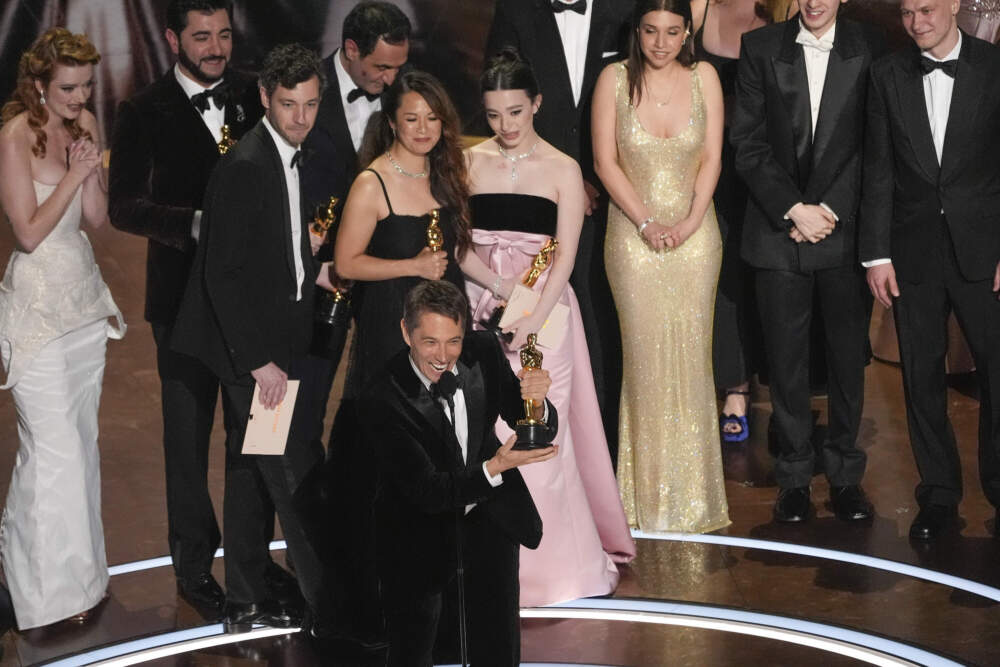 Lindsey Normington, from left, Alex Coco, Vache Tovmasyan, Sean Baker, Samantha Quan, Karren Karagulian Mikey Madison, Drew Daniels, Luna Sofía Miranda, Mark Eydelshteyn, and Yura Borisov accept the award for best picture for "Anora" during the Oscars on Sunday, March 2, 2025, at the Dolby Theatre in Los Angeles. (Chris Pizzello/AP)