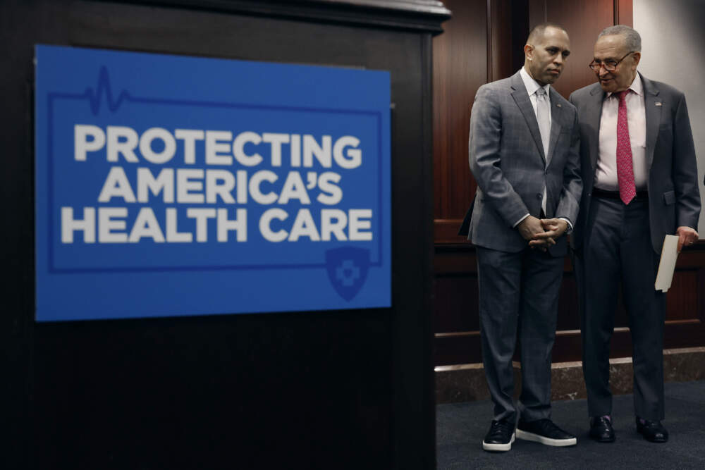 Senate Majority Leader Charles Schumer (D-NY) (R) talks with House Minority Leader Hakeem Jeffries (D-NY) while attend an event to mark the 14 anniversary of the passage of the Affordable Care Act at the U.S. Capitol on March 21, 2024 in Washington, DC. (Chip Somodevilla/Getty Images)