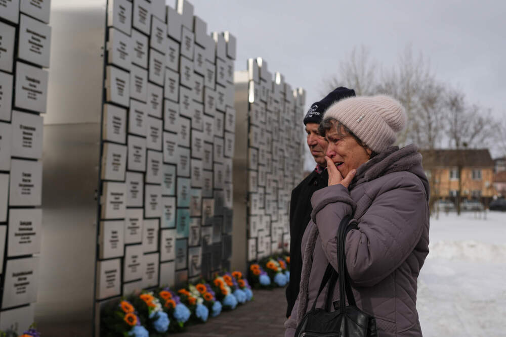 Relatives of those killed during the Russian occupation react at the Wall of Remembrance during a ceremony to mark the fourth anniversary of the Russian invasion of Ukraine, in Bucha, Ukraine, Tuesday, Feb. 24, 2026. (Sergei Grits/AP)