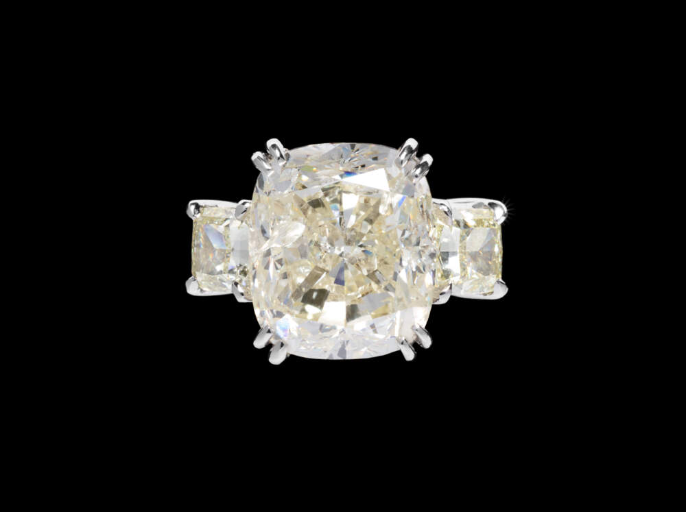 “And this diamond is also very beautiful. It has a slight undertone of yellow, and it's actually set into a ring flanked by two other diamonds. And this stone completely covers the width of my ring finger when I put it on. It probably extends beyond the width of my ring finger. So it's a very large stone. It would make a statement.”