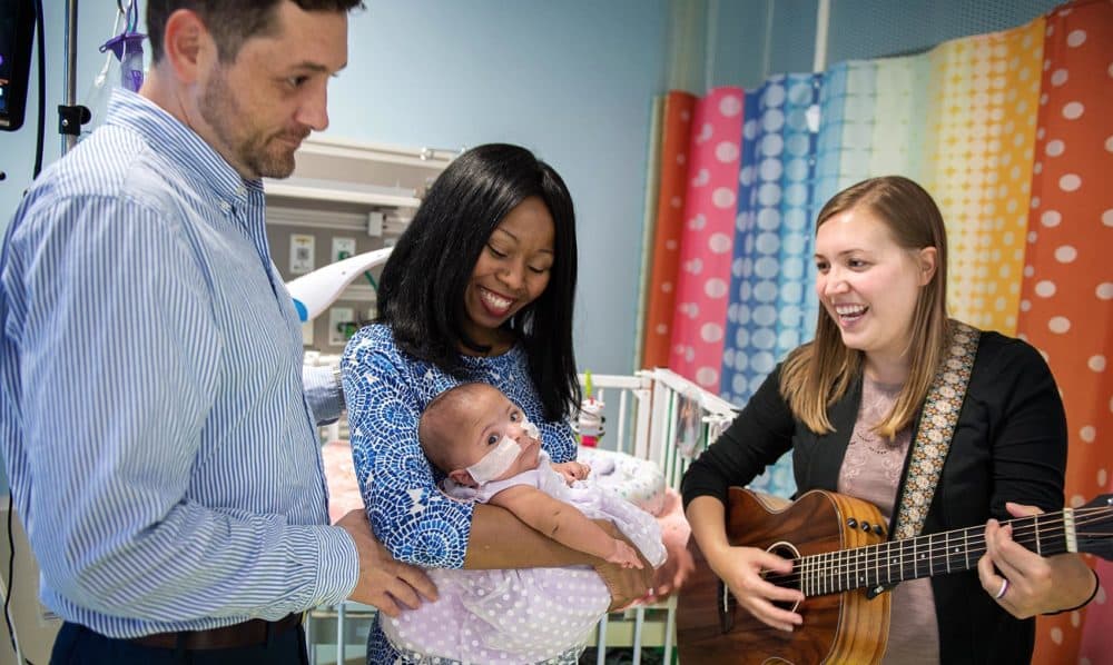 But her passion for music and helping others led her in a different direction. Bush now uses music to soothe children and anxious parents like LaWanda and Jason when they have to leave their sick babies behind at the hospital.