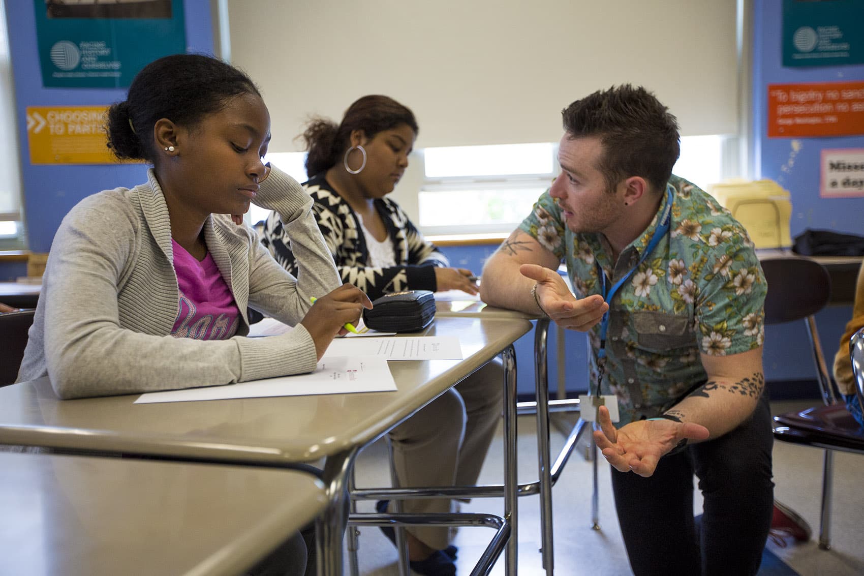 The students' instructors this day are attorneys Nate Koslof and Clark Freeman. Freeman starts off the session by asking the class about Miranda rights: "What is it that happens when a person is arrested?" The students pause, considering the question, before Koslof adds, "What might the police officers say?"