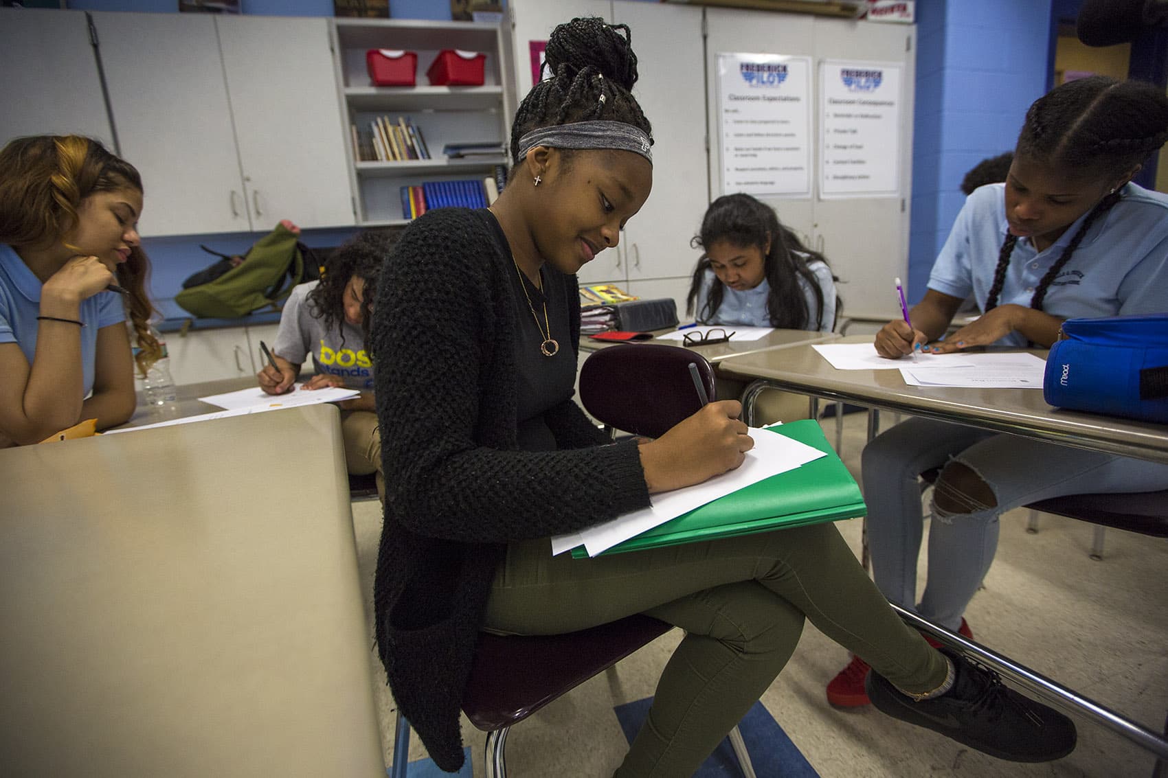 Eighth-graders file into teacher Tommy Simmons' humanities class at Lilla G. Frederick Middle School in Dorchester. This year, they’re reading about the civil rights era. But on this day, they’re getting a different lesson — how to assert their civil rights.