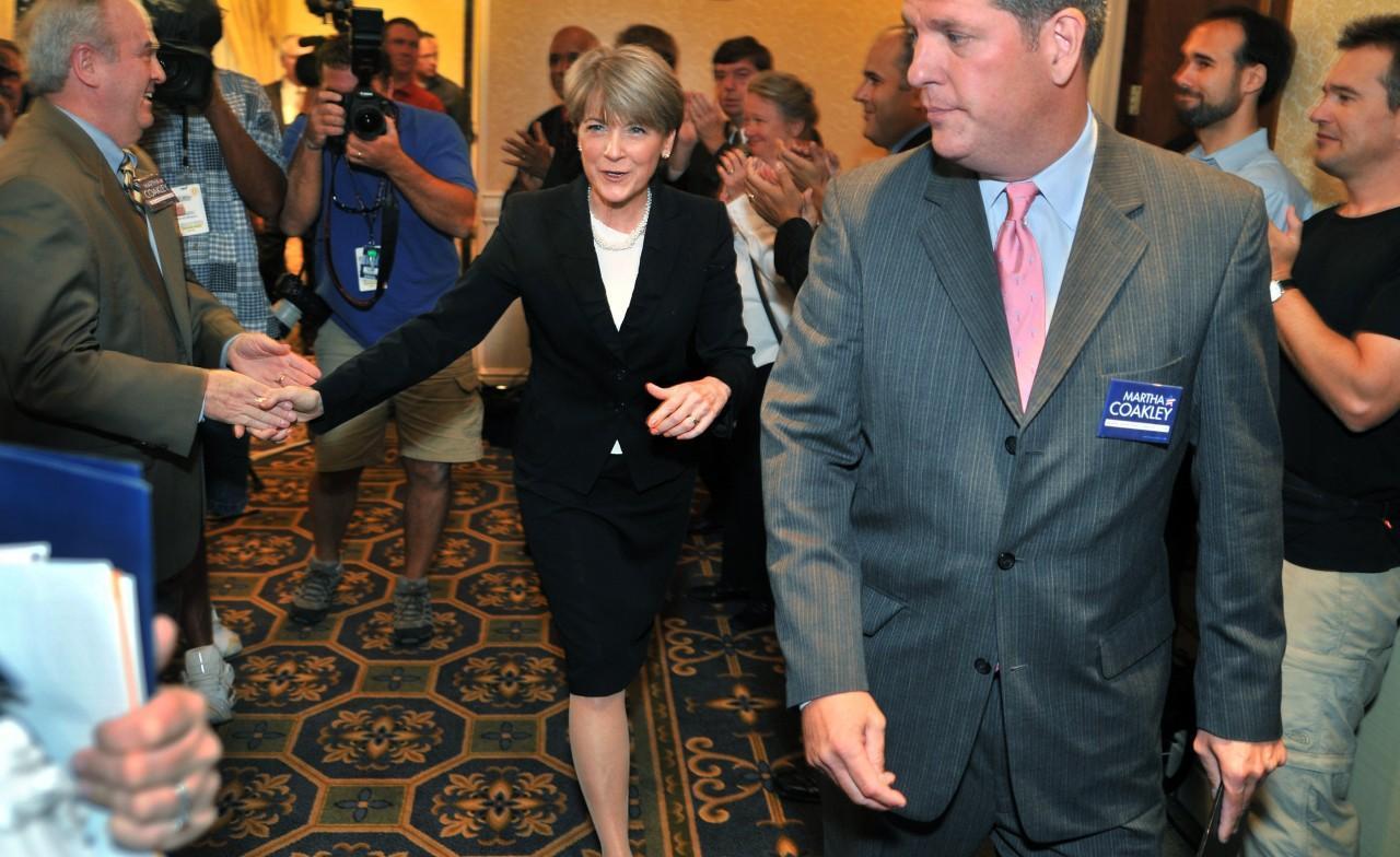 Massachusetts Attorney General Martha Coakley, center, and her husband, retired Cambridge Police Chief Tom O'Connor, right, shakes hands with supporters in Boston, Thursday, Sept. 3, 2009, as she leaves a news conference where she declared herself a Democratic candidate in the special election to succeed the late Sen. Edward M. Kennedy. (AP)