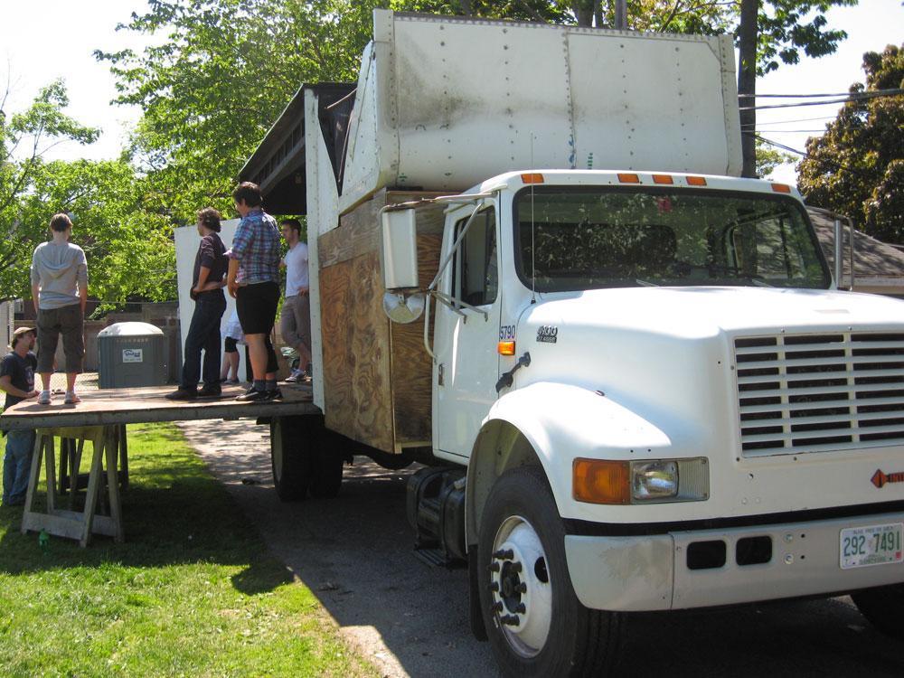 On this day, a few Boston-area actors stand watching the long side of the truck. A mechanical winch lowers the top edge down so it flops open like a giant slice of bread. With a little tweaking that slab of truck, now parallel to the ground, becomes the stage. It's wooden floor boards are a beautiful honey brown.
