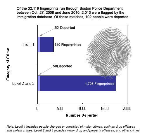 Between October of 2008 and June of this year, 102 people were deported as a result of Boston's participation. Almost half of them were charged with lower-level crimes.