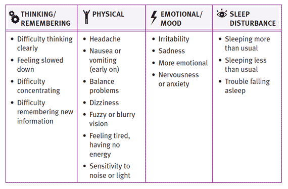 So what are the signs and symptoms of concussion? The list is long and varied, but it's basically: feeling sick or weird after a blow to the head. The CDC page on concussion is here. And here is their chart of possible symptoms, some of which may appear later: