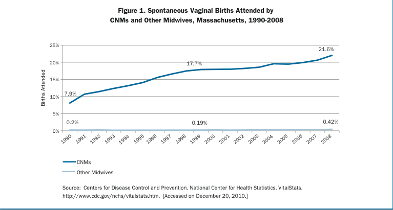 In Massachusetts, the number of nurse-midwife-attended vaginal births nearly tripled between 1990 and 2008 (from 7.9% to 21.6%) and there has also been a recent uptick in the rate of home births.