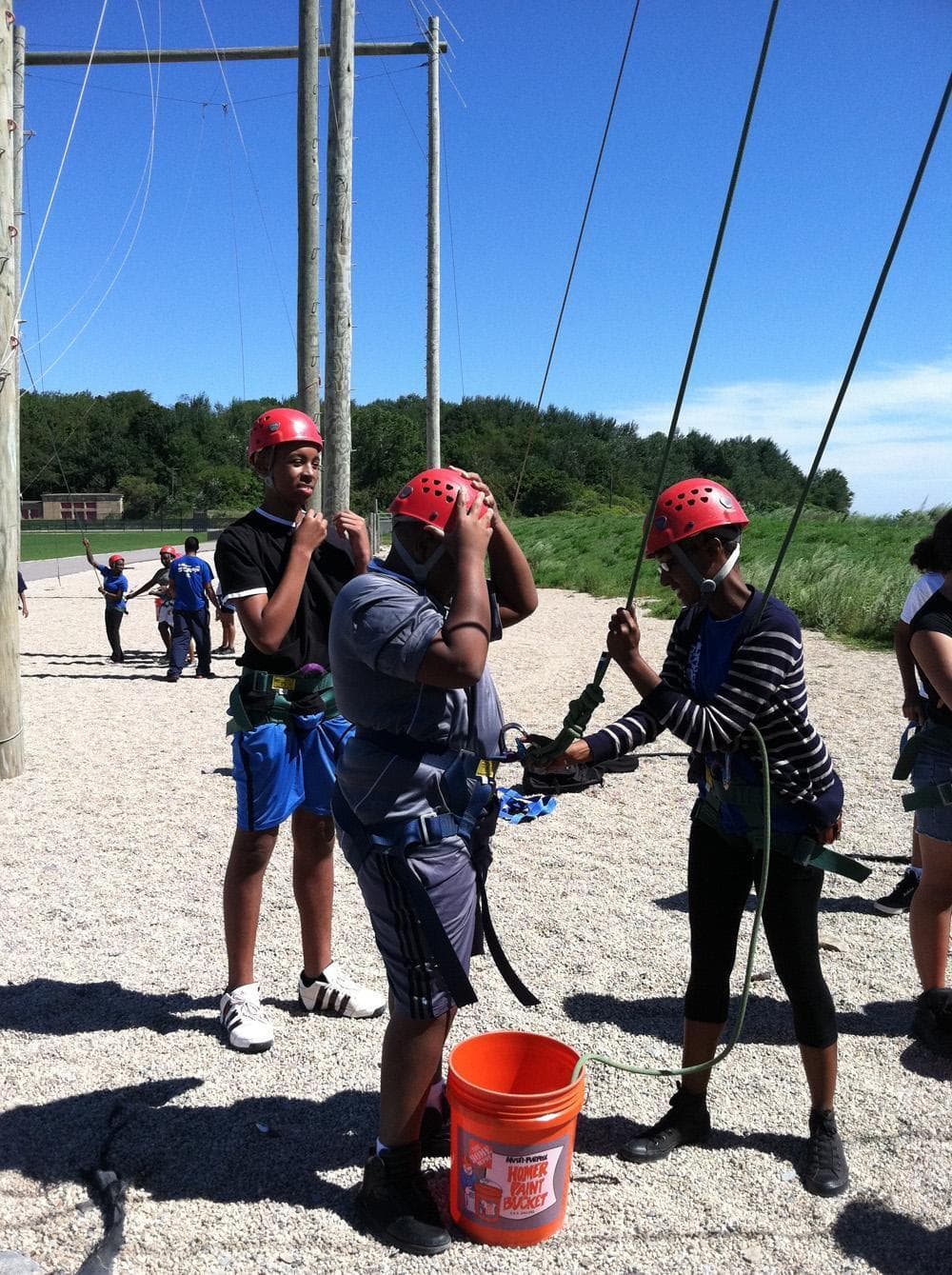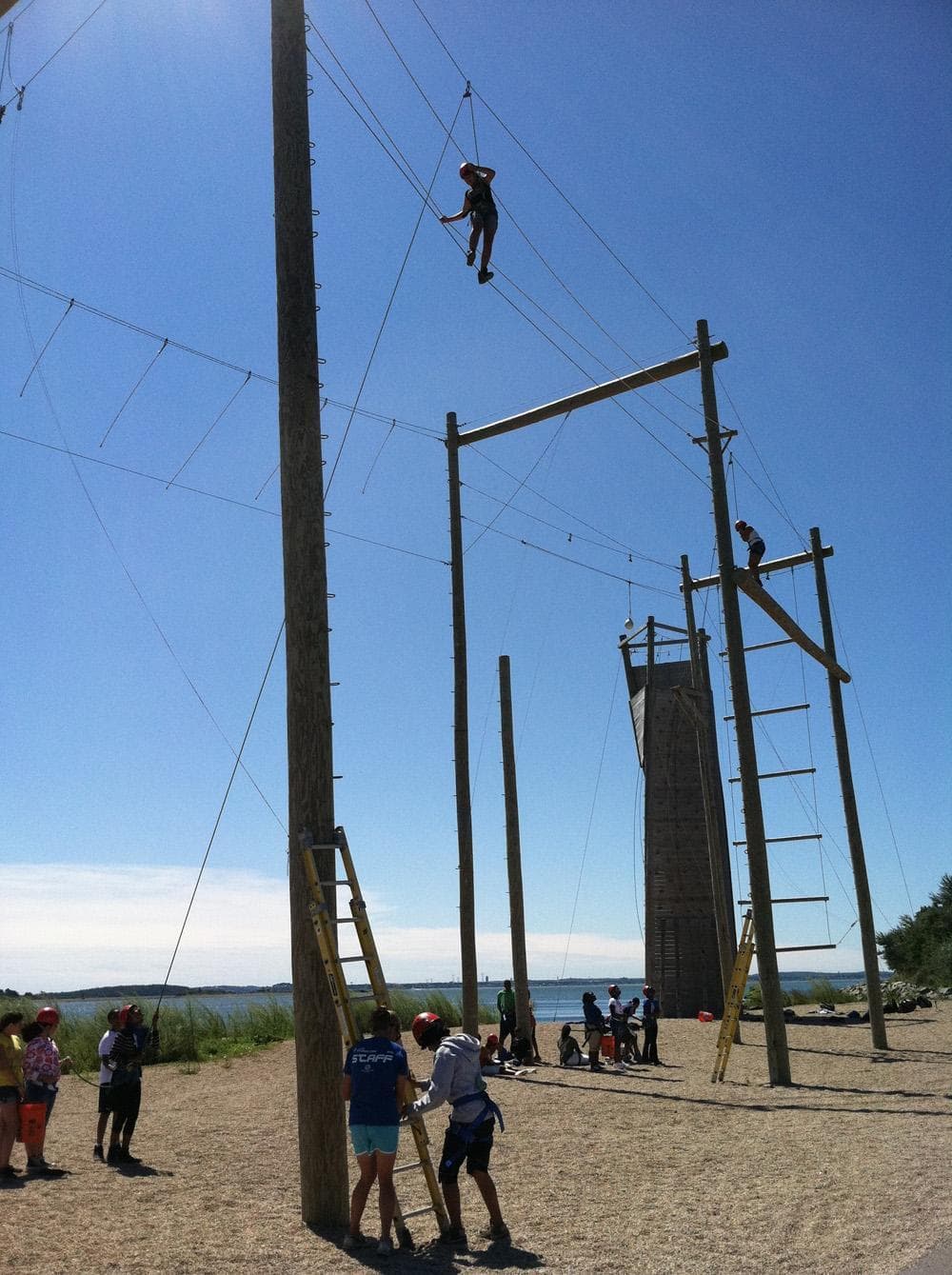 Children from the camp on a tightrope course (Delores Handy/WBUR)