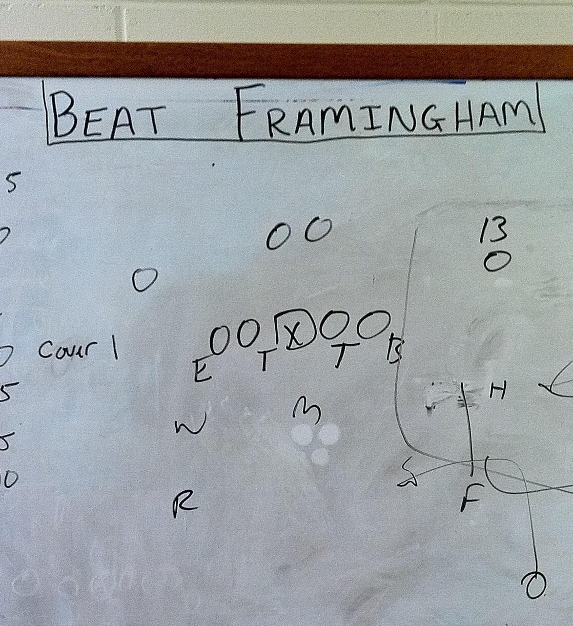 "Pump it and look for it," receivers coach Darren Flutie says as others look on, nodding. Darren played at Natick High like his star brother, Doug. The brothers played together at Boston College, and then in the Canadian Football League before Doug made it to the NFL. But Darren says the traditional Thanksgiving game against Framingham holds the most memories.