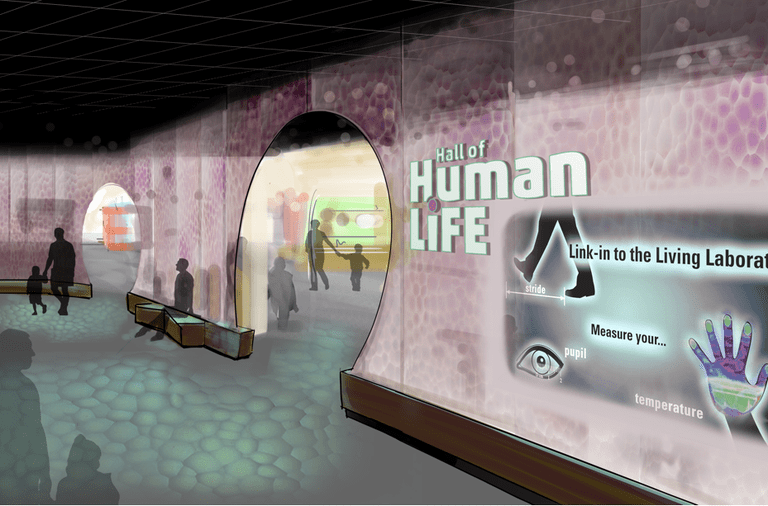 Visitors will enter the Hall of Human Life through a huge, semi-transparent membrane. By wearing a wristband featuring a unique (and anonymous) barcode, visitors will be able to record and contribute their own experiences directly to a Museum database. Museum-goers will measure their responses to five dynamic environments related to food, physical forces, living organisms, social experience, and time. The Hall of Human Life will also feature a Provocative Questions area, where visitors will discuss public policy questions about socio-scientific issues to develop critical thinking skills, and a Living Laboratory, where scientists conducting research in human biology will invite visitors to become subjects and learn about their studies. The Exploration Hub will sit at the heart of the exhibit, where Museum educators, health and biology students, and retired researchers will address visitors' questions and assist in experiments and dissections.
