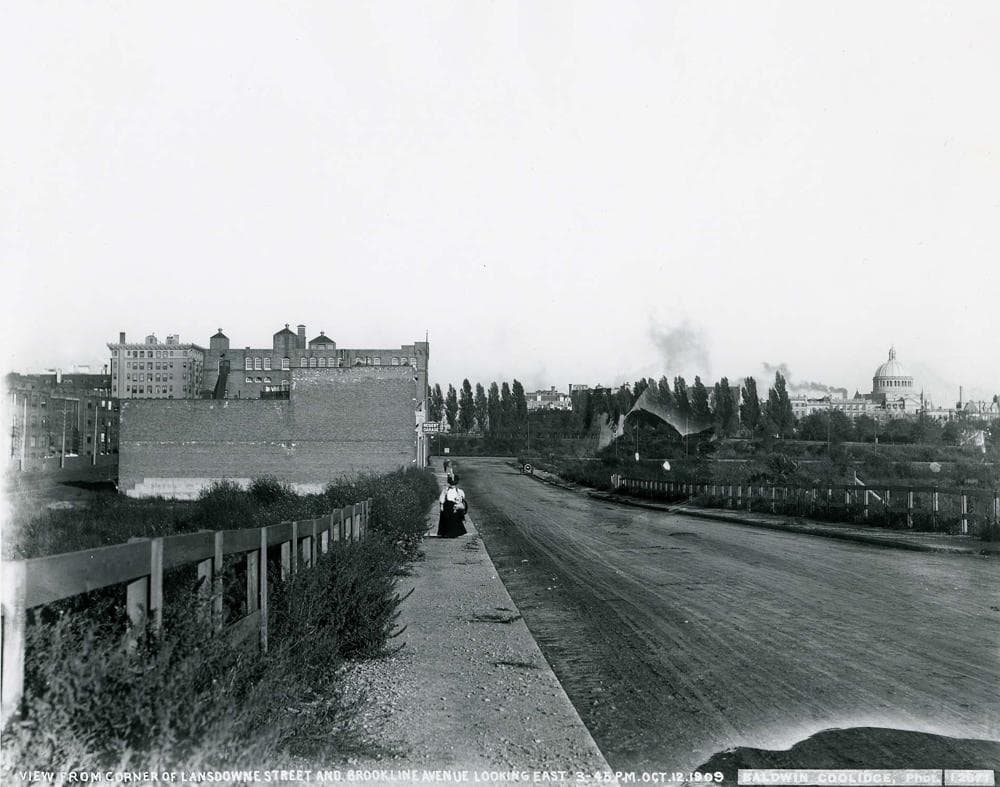 In one print from 1909, Lansdowne Street is a dirt road. On both sides: just weeds and scrub.
