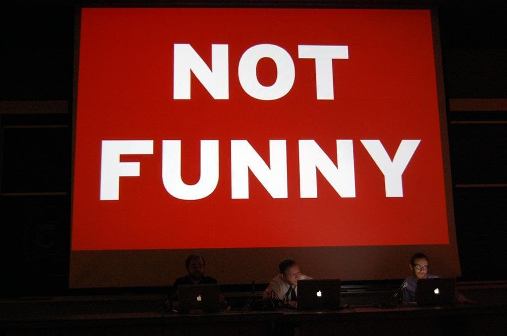 The group Meme Factory — consisting of Mike Rugnetta, Stephen Bruckert and Patrick Davison — during their ROFLCon performance, "The Internet Is Not Funny." (Aayesha Siddiqui/WBUR)
