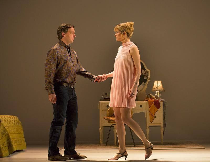 Nevertheless, director Maria Aitken and her designers have done fine, unexpected things with the play (at the BU Theatre, through Dec. 9), beginning with Allen Moyer’s spare set design. Someone once said that Huntington audiences leave the theater humming the scenery and if that’s so they’ll be singing a different tune after this short play. The theater’s curtain forms cutout rectangles of the stage, positioning the characters in different times and places. Emma and Jerry meet in a pub, a small space on the lower left of the stage. Jerry has betrayed Robert, Emma’s husband and his close friend, and when the two men meet it’s in large horizontal rooms punctuated by tasteful modern furniture. But only punctuated as the idea is to let a small table or a mattress on the floor speak volumes of who these people are.