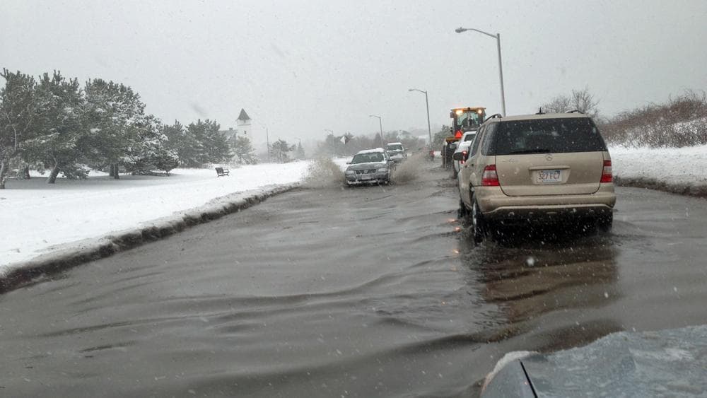 Nahant Road in Nahant floods on Friday morning. (Jesse Costa/WBUR)