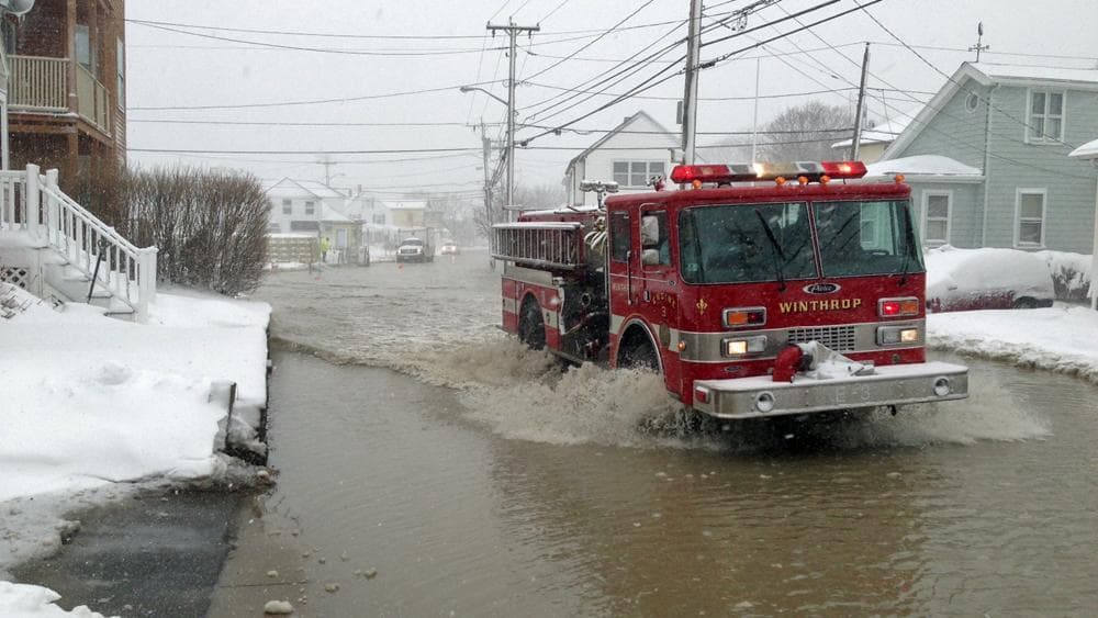 A firetruck drives down a flooded street on Shirley Point in Winthrop Friday morning. (Jesse Costa/WBUR)