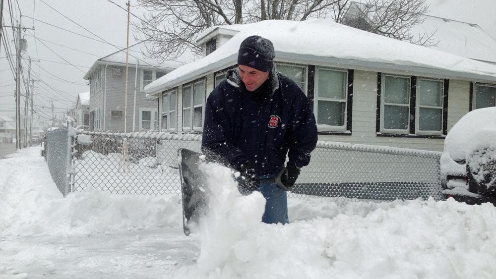 A Winthrop resident shovels snow Friday morning. (Jesse Costa/WBUR)