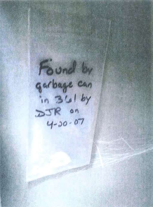Anne Goldbach is forensic services director for the Committee for Public Counsel Services, the state agency that handles legal representation for poor people, many of whom have cases connected to the drug lab scandal. In an interview, Goldbach pointed to a photo of an apparent drug sample in a plastic bag taped inside a desk cabinet. Written in marker is the description "found by garbage can."