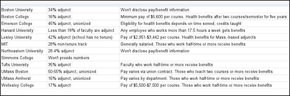 Table: Adjunct Percentages, Pay, Benefits At Select Mass. Schools