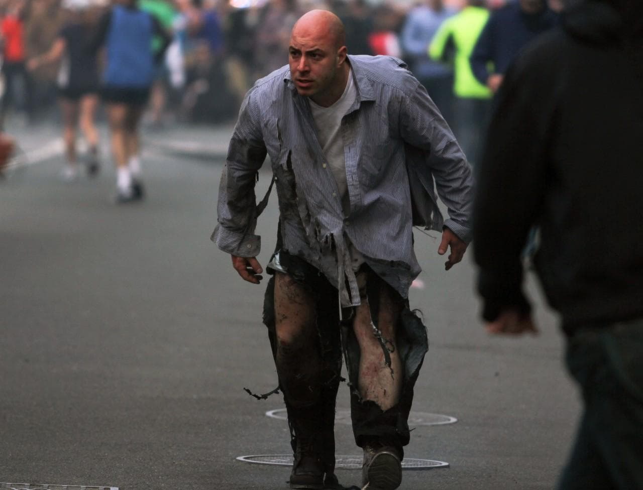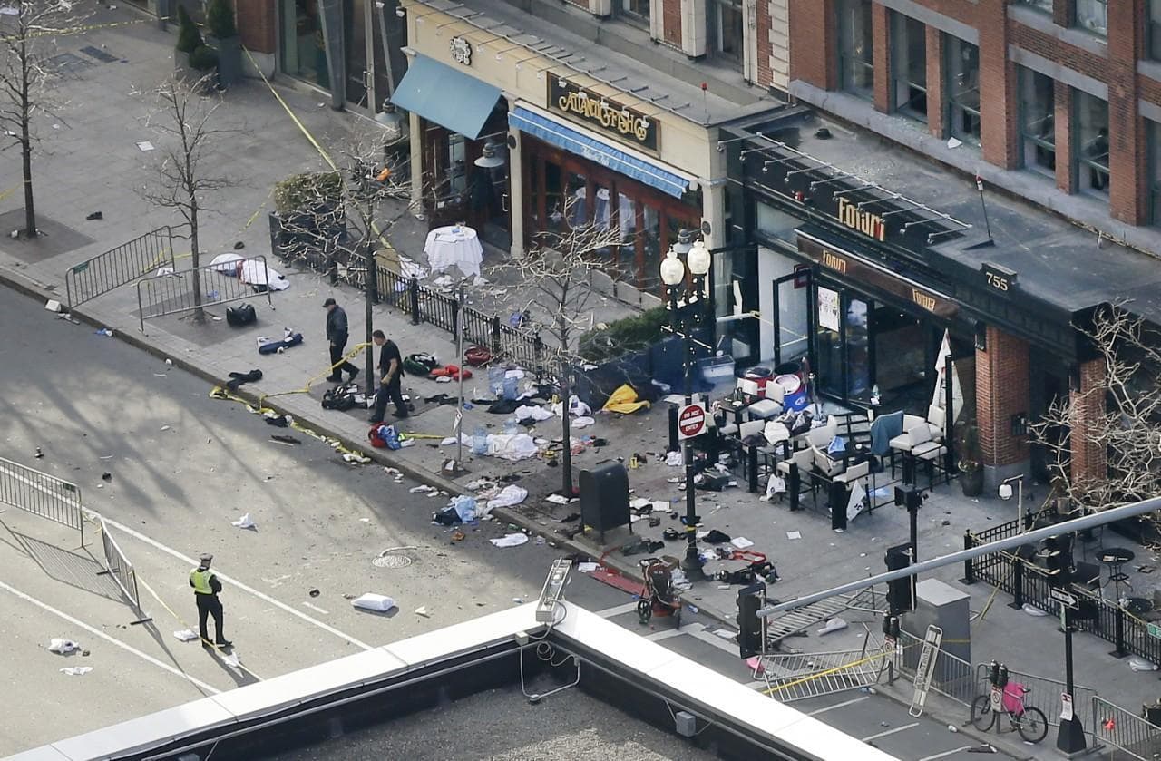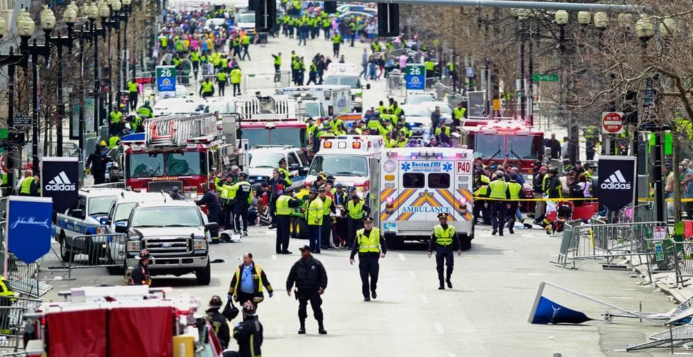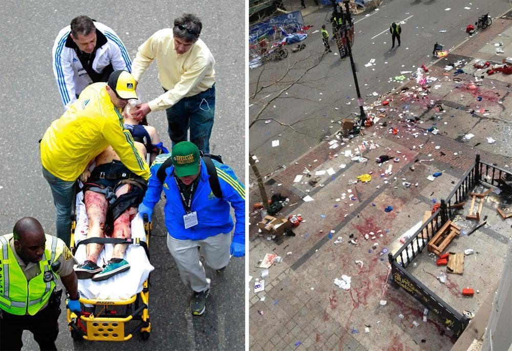 People assist an injured man after the explosions. (AP Photo/The Daily Free Press, Kenshin Okubo)Justine Franco of Montpelier, Vt., holds up a sign looking for her missing friend, April, who was running in her first Boston Marathon. (AP Photo/Winslow Townson)A marathon runner leaves the course near Copley Square. (AP Photo/Winslow Townson)A man in the crowd following the explosion. (AP Photo/The Daily Free Press, Kenshin Okubo)Firefighters tend to a man at the finish line. (AP Photo/Michael Dwyer)Medical workers aid an injured woman at the finish line. (AP Photo/Charles Krupa)Two police officers with rifles watch from the roof of the Lenox Hotel, overlooking the finish area, following the explosions. (AP Photo/Elise Amendola)Gov. Deval Patrick pauses as he speaks about the explosions during a news conference as Boston Police Commissioner Edward Davis, left, looks on. (AP Photo/Bizuayehu Tesfaye)Members of the Massachusetts National Guard wait for orders on Boston Common in the evening following the explosion. (AP Photo/Michael Dwyer)Emergency responders comfort a woman on a stretcher who was injured in one of the blasts near the finish line. (AP Photo/Jeremy Pavia)The second blast site is investigated and guarded by police. (AP Photo/Elise Amendola)One of the two blast sites on Boylston Street is investigated on Monday. (Elise Amendola/AP)Medical workers aid injured people at the finish line following the explosion. (Charles Krupa/AP)LEFT: Medical workers aid a victim. (Charles Krupa/AP). RIGHT: The scene after the two explosions. (Bruce Mendelsohn/AP)Police clear the area at the finish line as medical workers help the injured. (Charles Krupa/AP)Runners' belongings piled up at the corner of Boylston and Berkeley Streets. (Steve Brown/WBUR)The National Guard gathers on Boston Common. (Steve Brown/WBUR)A Boston police officer patrols the area near the finish line following the explosion. (Josh Reynolds/AP)People react to the explosion at the 2013 Boston Marathon. (The Daily Free Press, Kenshin Okubo/AP)People react to the explosion at the 2013 Boston Marathon. (The Daily Free Press, Kenshin Okubo/AP)Women react as they leave the area of the explosion. (Josh Reynolds/AP)Boylston Street and Berkeley Street in the aftermath of the explosion. (Steve Brown/WBUR)Police seal off the marathon route and move everyone out of the area. (Robin Lubbock/WBUR)Medical workers aid an injured man at the finish line. (Charles Krupa/AP)A Boston police officer clears Boylston Street following the explosion at the finish line. (Charles Krupa/AP)Medical responders run an injured man whose limbs were severely injured. (Charles Krupa/AP)Medical workers wheel the injured across the finish line. (Charles Krupa/AP)Medical workers aid injured people at the finish line. (Charles Krupa/AP)Medical workers aid injured people at the finish line. (Charles Krupa/AP)