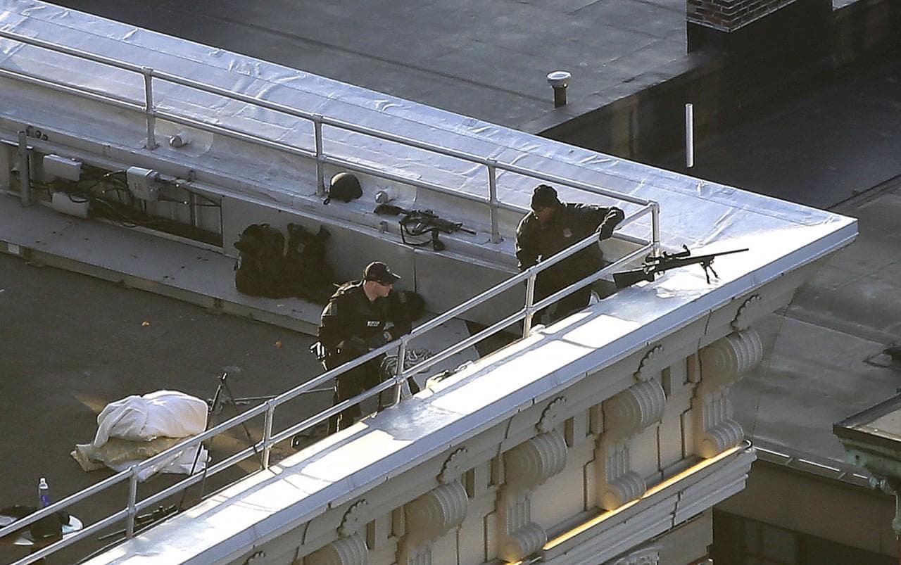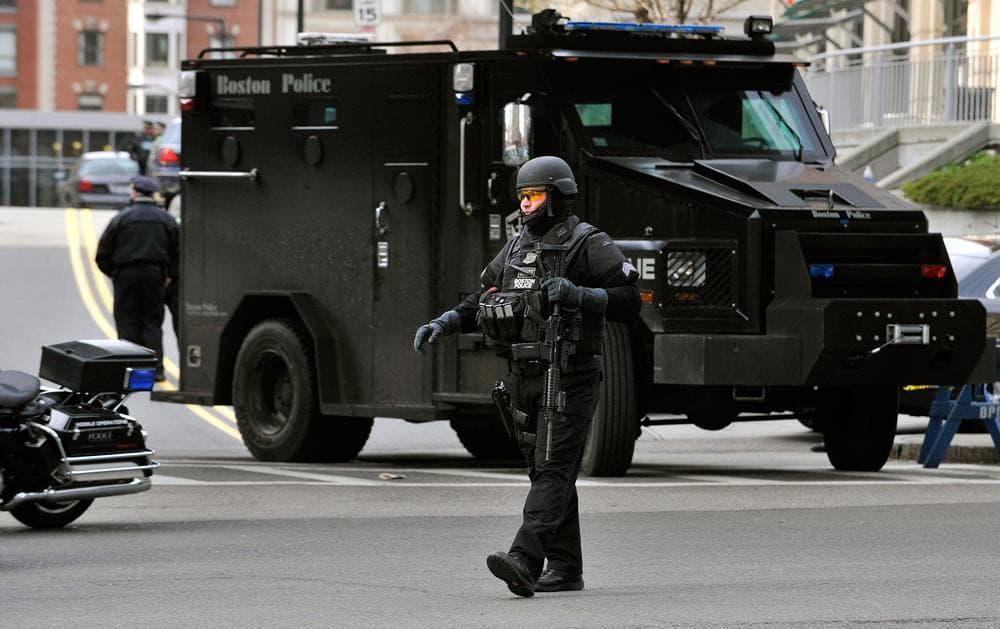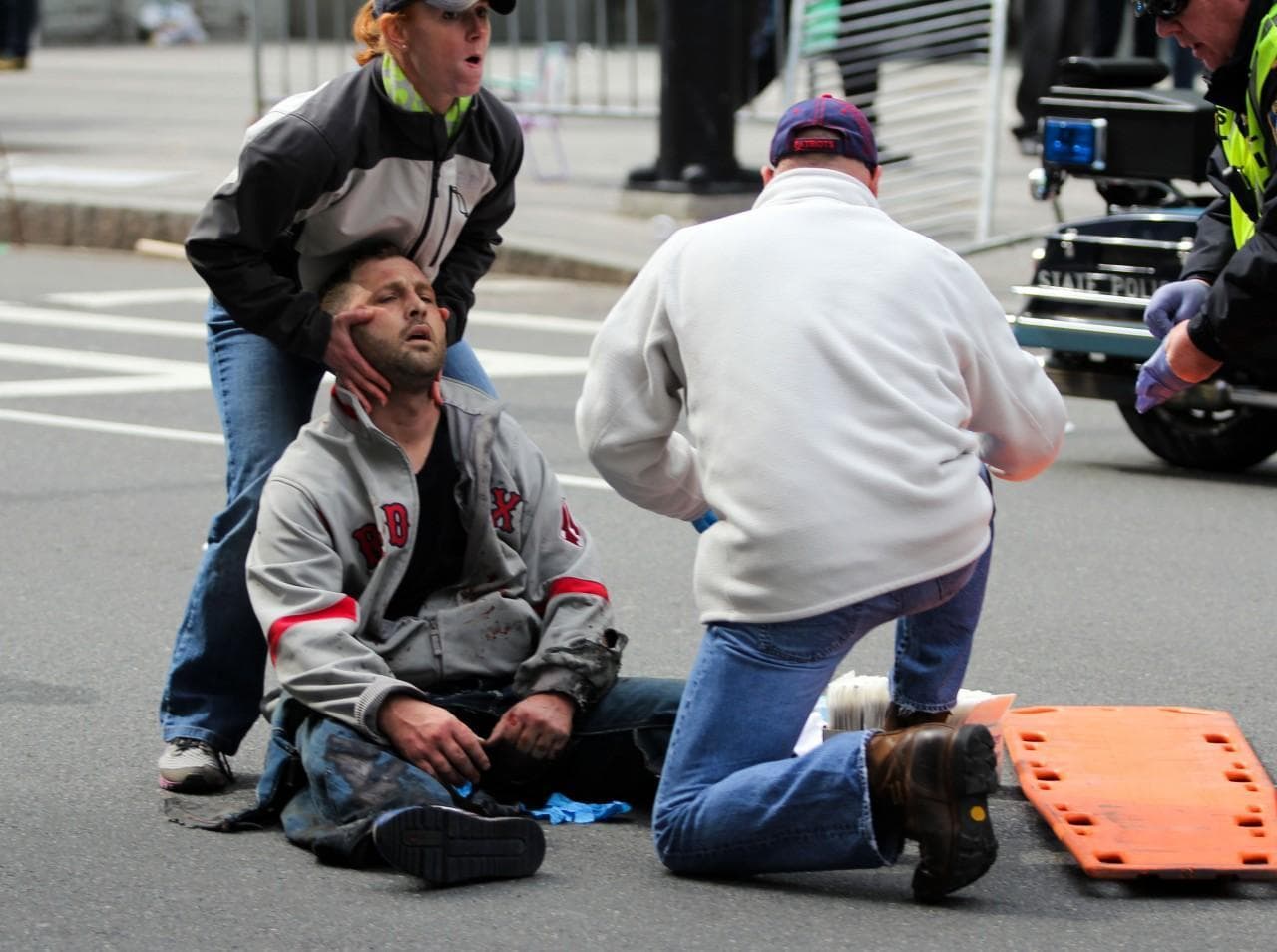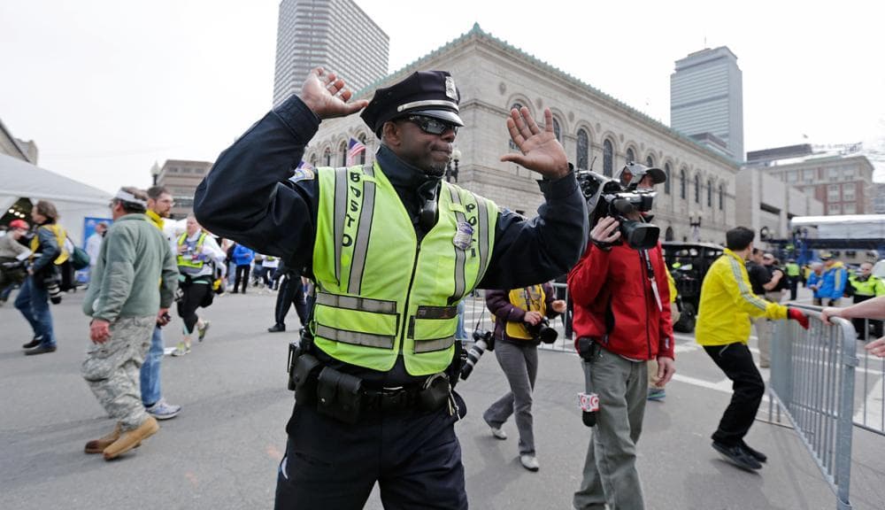 People assist an injured man after the explosions. (AP Photo/The Daily Free Press, Kenshin Okubo)Justine Franco of Montpelier, Vt., holds up a sign looking for her missing friend, April, who was running in her first Boston Marathon. (AP Photo/Winslow Townson)A marathon runner leaves the course near Copley Square. (AP Photo/Winslow Townson)A man in the crowd following the explosion. (AP Photo/The Daily Free Press, Kenshin Okubo)Firefighters tend to a man at the finish line. (AP Photo/Michael Dwyer)Medical workers aid an injured woman at the finish line. (AP Photo/Charles Krupa)Two police officers with rifles watch from the roof of the Lenox Hotel, overlooking the finish area, following the explosions. (AP Photo/Elise Amendola)Gov. Deval Patrick pauses as he speaks about the explosions during a news conference as Boston Police Commissioner Edward Davis, left, looks on. (AP Photo/Bizuayehu Tesfaye)Members of the Massachusetts National Guard wait for orders on Boston Common in the evening following the explosion. (AP Photo/Michael Dwyer)Emergency responders comfort a woman on a stretcher who was injured in one of the blasts near the finish line. (AP Photo/Jeremy Pavia)The second blast site is investigated and guarded by police. (AP Photo/Elise Amendola)One of the two blast sites on Boylston Street is investigated on Monday. (Elise Amendola/AP)Medical workers aid injured people at the finish line following the explosion. (Charles Krupa/AP)LEFT: Medical workers aid a victim. (Charles Krupa/AP). RIGHT: The scene after the two explosions. (Bruce Mendelsohn/AP)Police clear the area at the finish line as medical workers help the injured. (Charles Krupa/AP)Runners' belongings piled up at the corner of Boylston and Berkeley Streets. (Steve Brown/WBUR)The National Guard gathers on Boston Common. (Steve Brown/WBUR)A Boston police officer patrols the area near the finish line following the explosion. (Josh Reynolds/AP)People react to the explosion at the 2013 Boston Marathon. (The Daily Free Press, Kenshin Okubo/AP)People react to the explosion at the 2013 Boston Marathon. (The Daily Free Press, Kenshin Okubo/AP)Women react as they leave the area of the explosion. (Josh Reynolds/AP)Boylston Street and Berkeley Street in the aftermath of the explosion. (Steve Brown/WBUR)Police seal off the marathon route and move everyone out of the area. (Robin Lubbock/WBUR)Medical workers aid an injured man at the finish line. (Charles Krupa/AP)A Boston police officer clears Boylston Street following the explosion at the finish line. (Charles Krupa/AP)Medical responders run an injured man whose limbs were severely injured. (Charles Krupa/AP)Medical workers wheel the injured across the finish line. (Charles Krupa/AP)Medical workers aid injured people at the finish line. (Charles Krupa/AP)Medical workers aid injured people at the finish line. (Charles Krupa/AP)