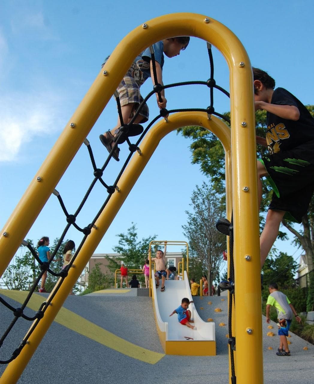 SOMERVILLE, Mass. — Hundreds of children swarmed into Chuckie Harris Park for the public party celebrating its opening Monday evening. It’s the newest park in East Somerville — and its yellow and gray minimal, industrial design is another example of the quiet revolution taking place in playground design.