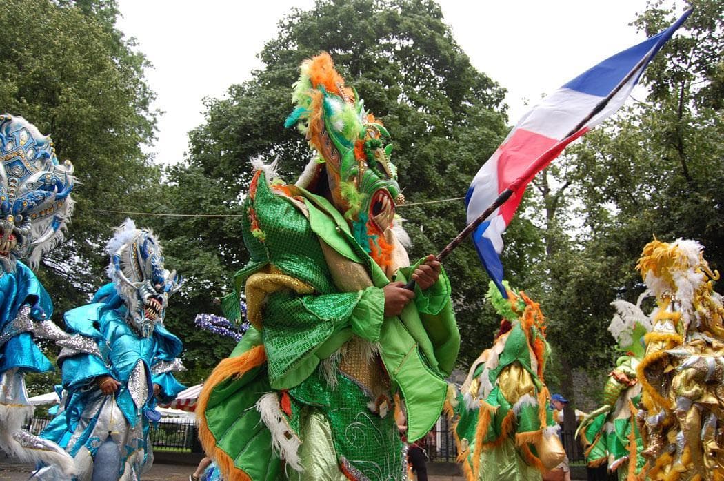 “The natives used to do a mockery on the Spaniards,” organizer Stelvyn Mirabal of Lawrence explained to me last year. “The Spaniards used to wear the suits when Christopher Columbus discovered America. So that’s the suits. And the faces—they were like devils.”
