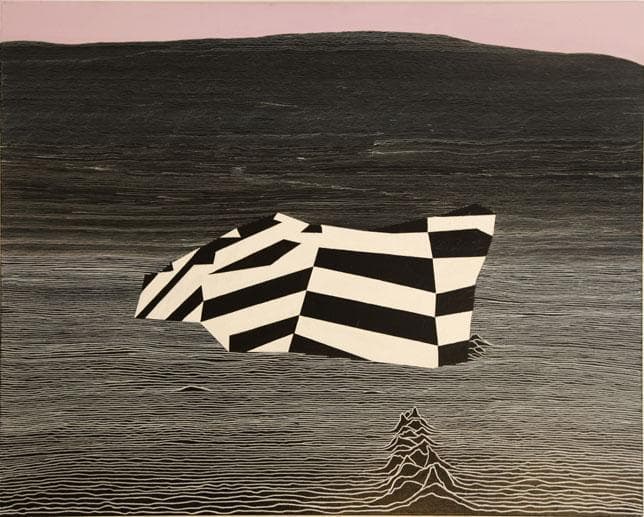 Sloat is a chameleon of an artist. Over the past decade, his shows have included Michael Jackson depicted in sculptures and faux stained glass windows; sculptures made from stiffened shopping bags; poetry written by collecting old record sleeves; and installations in which birds seem to crash into glass doors. In the Bostonian’s September show, he turned to painting with two canvases in particular standing out. "Swell (New Dawn Fades)" was based on an image of a ship painted with World War I dazzle camouflage riding on a digital visualization of pulsar signals. In other words, it was a weird striped geometric lump floating on a field of rippling lines that brought to mind the iconic image of wave patterns of a pulsar used on the cover of Joy Division’s 1979 album “Unknown Pleasures.” Sloat then photographed his painting, inverted it digitally, and repainted it with the resulting glitches as "Swell (Midnight Rises).” His inspiration was how technology modulates our experience of life. The results were strange and alluring and catchy painting.