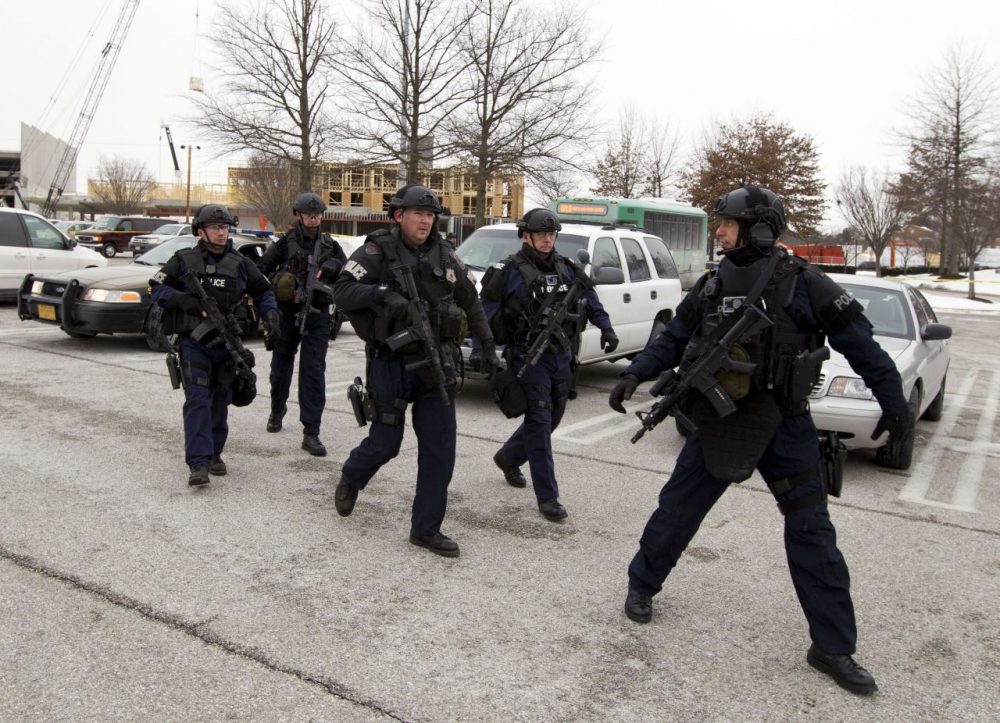 Police move in from a parking lot to the Mall in Columbia on Saturday. (Jose Luis Magana/AP)