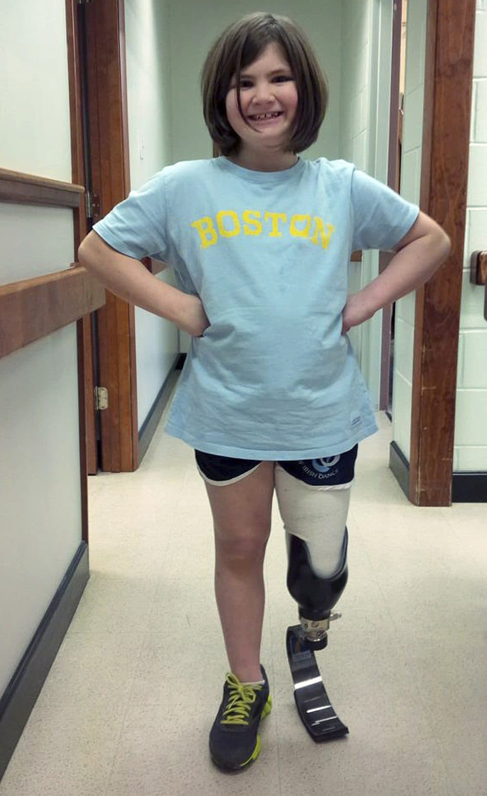 A photo released by the family Friday shows Jane Richard, now 8, grinning widely while wearing a new prosthetic leg designed for running and everyday activities.