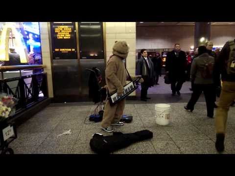 It was probably only a matter of time before some enterprising and talented street musician decided to don a teddy bear costume so that he might make funky work of pop jams on the keytar (that’s a keyboard-guitar hybrid, duh), winning over MBTA commuters and Faneuil Hall tourists alike.