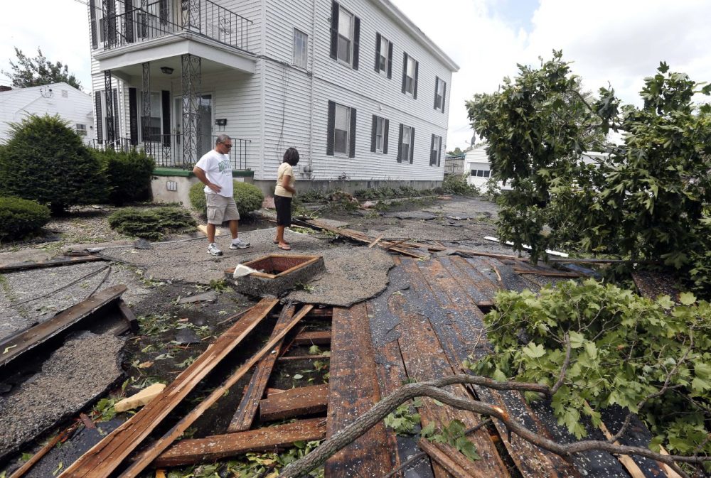 Christine Molle and her husband, Wayne, survey the damage to her mother's house in Revere after a tornado touched down there Monday morning. (Elise Amendola/AP)Master Auto manager Marie Annaloro, left, and Victoria Ohlson sweep glass and debris in the service garage where the roof blew off in Revere Monday. (Elise Amendola/AP)The National Weather Service says this is the first tornado in Suffolk County since the agency began keeping records on them in 1950. (Elise Amendola/AP)Homeowner Lenny DiBartolomeo, right, waves a flag as he and his tenant Wayne Devaughn, left, observe damage to their house. Both men said they were grateful that they knew of no injuries. (Elise Amendola/AP)Ellen Bertino, left, and others look out at downed trees and power lines. (Elise Amendola/AP)The tornado was spawned by a powerful storm that moved through the Boston area shortly after 9 a.m. Deputy Fire Chief Mike Viviano said his department received dozens of calls reporting partial building and roof collapses, and downed trees and power lines. (Jack Lepiarz/WBUR)Revere officials say there were no immediate reports of serious injuries. (Courtesy Mass. State Police)Revere Fire Chief Gene Doherty says 65 buildings were substantially damaged, and thirteen of those were left uninhabitable. (Elise Amendola/AP)(Jack Lepiarz/WBUR)At Revere City Hall, windows were knocked out by the storm. (Jack Lepiarz/WBUR)