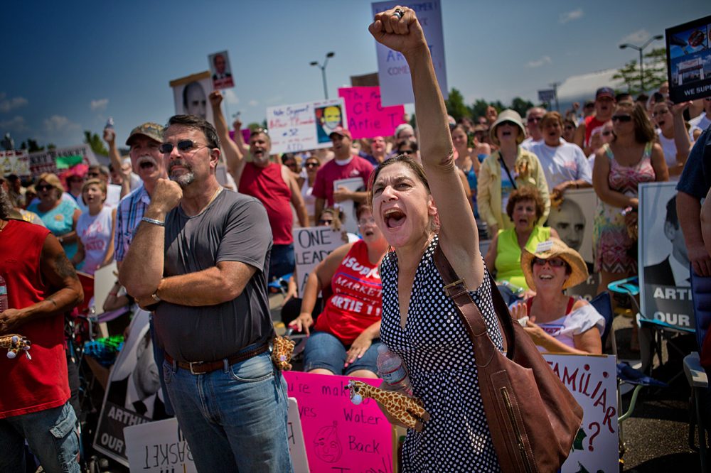 Market Basket employees and customers calling for the reinstatement of ousted CEO Arthur T. Demoulas held their fourth large rally in Tewksbury on Tuesday. (Jesse Costa/WBUR)Employees of the Bellingham Market Basket store filed into the Stadium Plaza parking lot. Over the last two weeks, hundreds of warehouse workers and drivers have refused to make deliveries to the chain’s 71 stores. (Jesse Costa/WBUR)Karen Silva, of Billerica, made a sign before the rally Tuesday. She worked for Market Basket for over 11 years and has been shopping at the store for 38 years. (Jesse Costa/WBUR)Some protesters held hands and said a prayer to begin the rally. (Jesse Costa/WBUR)(Jesse Costa/WBUR)The rally had the atmosphere of an outdoor rock festival, as participants threw beach balls high in the air and music blasted from large speakers set up along the parking lot. (Jesse Costa/WBUR)Steve Paulenka, who was fired over the protests, speaks to the crowd. “Our resolve has galvanized to something a lot firmer than it was,” he told WBUR before the rally. “The customers aren’t coming back until we come back, and we’re not coming back until the boss comes back.” (Jesse Cosyta/WBUR)Protesters carried signs with blown-up photographs of Arthur T. Demoulas, while some loyal shoppers carried signs saying, “We are the customers. We quit.” (Jesse Costa/WBUR)(Jesse Costa/WBUR)Workers hope that Arthur S. Demoulas’ side of the family will accept an offer from his cousin, Arthur T., to buy the company. The board has said it is considering that offer as well as others.(Jesse Costa/WBUR)(Jesse Costa/WBUR)