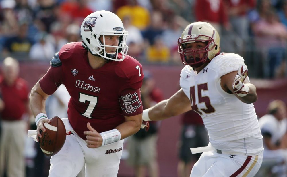 Blake Frohnapfel completed 9 of 22 passes for 147 yards for the Minutemen, including a 77-yard scoring toss to Tajae Sharpe.