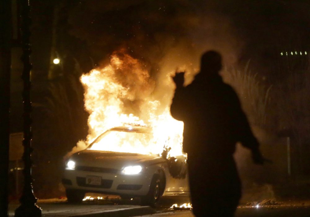 Lesley McSpadden, the mother of Michael Brown, wearing sunglasses, reacts as she listens to the announcement of the grand jury decision. (Charlie Riedel/AP)Police gather on the street as protesters react after the announcement of the grand jury decision. (Charlie Riedel/AP)A protester squirts lighter fluid on a police car as the car windows are shuttered near the Ferguson Police Department. (Charlie Riedel/AP)A police car is set on fire after a group of protesters vandalize the vehicle. (Charlie Riedel/AP)Police arrive at a business as cars in a parking lot next to the building burn. (Charlie Riedel/AP)Protesters run for shelter as smoke fills the streets. (David Goldman/AP)