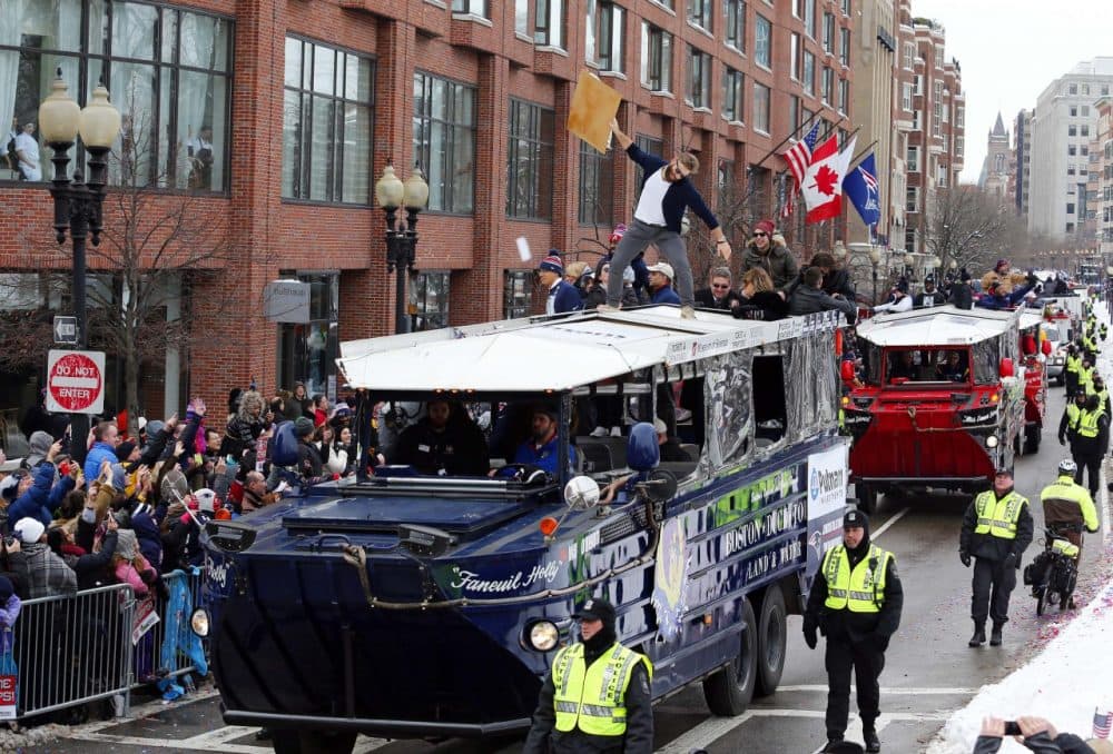 Patriots receiver Julian Edelman responds to cheers from the crowd from atop a duck boat. (Winslow Townson/AP)