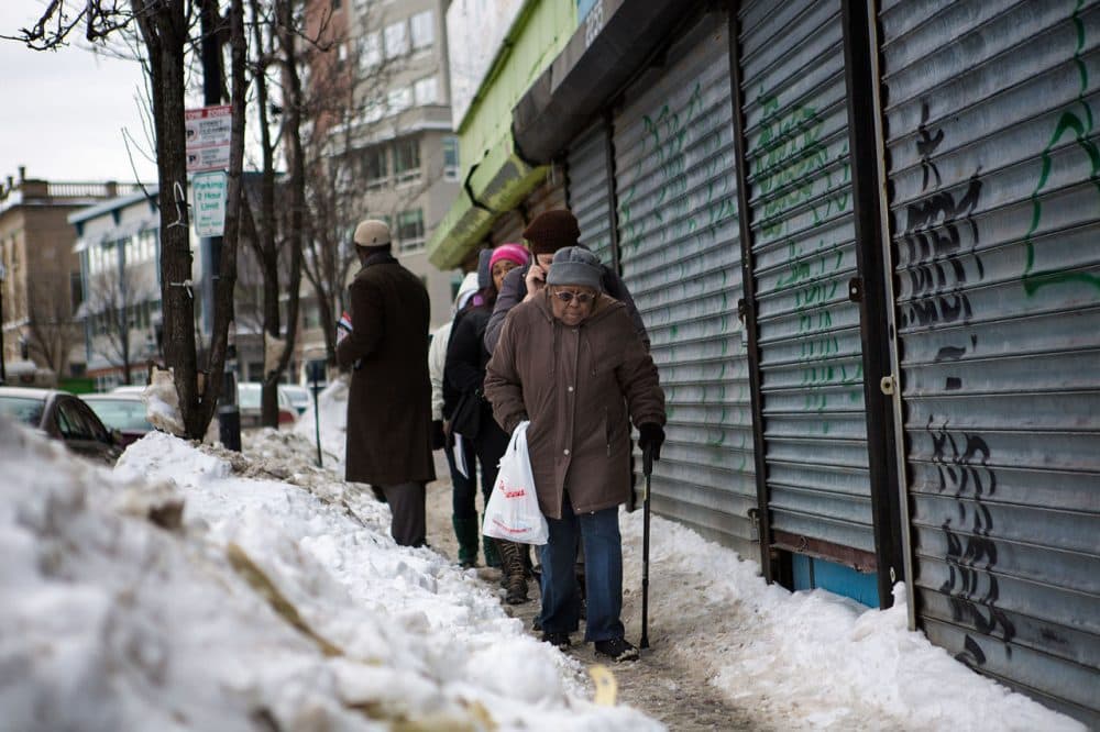 Navigating through one such snowy path at the intersection of Washington Street and Malcolm X was 82-year-old Pauline Sheridan, of Roxbury.