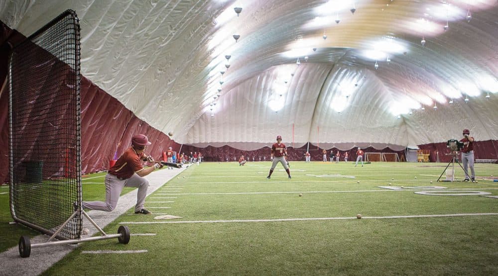 This winter's record-breaking snowfall has some college sports teams wondering where they will be playing their first spring games, including Boston College's baseball team, pictured here during a practice earlier this week. (Jesse Costa/WBUR)