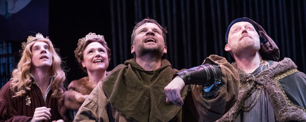 The other characters are vibrant and even frightening right out of the gate. Margaret is something of a femme fatale. Henry’s uncle, the Duke of Gloucester (Allyn Burrows), is not swept up in beatitudes, but he is a decent and truly noble man. As such, he’s instantly in the crosshairs of those who seek to bring down the king, and it’s his ambitious wife — Duchess Eleanor (Marya Lowry), a sort of Lady Macbeth-lite — who proves his Achilles’ heel. Eleanor is lured into participating in an act of sorcery that, as played here, runs chills up the backbone, thanks to Tina Packer’s direction, Daniel H. Jentzen’s dramatic lighting scheme and especially Steve Deptula’s sound design, which is rich and well-judged. (While we’re on the topic of the production’s auditory components, let me not forget to pay homage to Alexander Sovronsky’s Elizabethan-tinged musical score.)