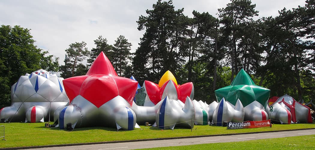 From the outside, “Pentalum” resembles a village of star- and crystal-shaped tents, rising 20 feet tall and stretching 180 feet long. Inside the inflated structures, you explore a series of round passages that open onto domed chambers. The rooms glow blue, red and green as ambient music hums. Lawn on D describes it as “one part science-fiction space station, one part colorful dream, one part futuristic playground.”