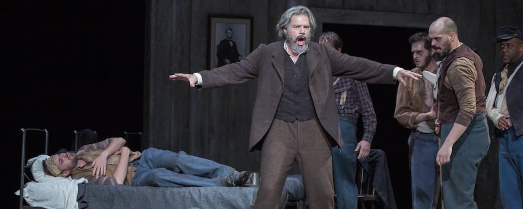 Rod Gilfry’s Whitman locks musical horns through the 100 or so minutes with Alexander Lewis’s John Wormley, a mysterious figure who looks like a vampire but, his accent tells us, might be a Southern interloper. The two are terrific singers, though Wormley has the more interesting music.