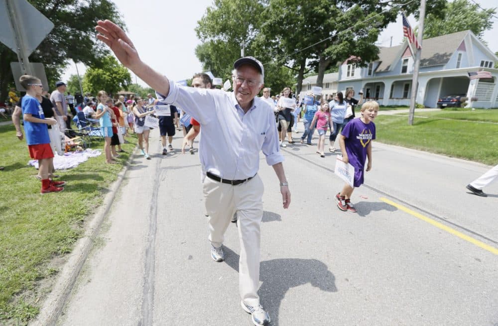 Democratic presidential candidate Sen. Bernie Sanders greets local residents in a Fourth of July parade in Waukee, Iowa. (Charlie Neibergall/AP)