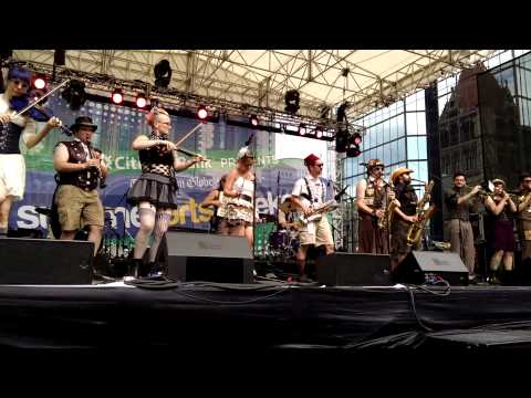 The Boston area steam-funk outfit is always a weird and welcome sight. They dress like circus performers and play brass-driven funk, pop, and jazz tunes.