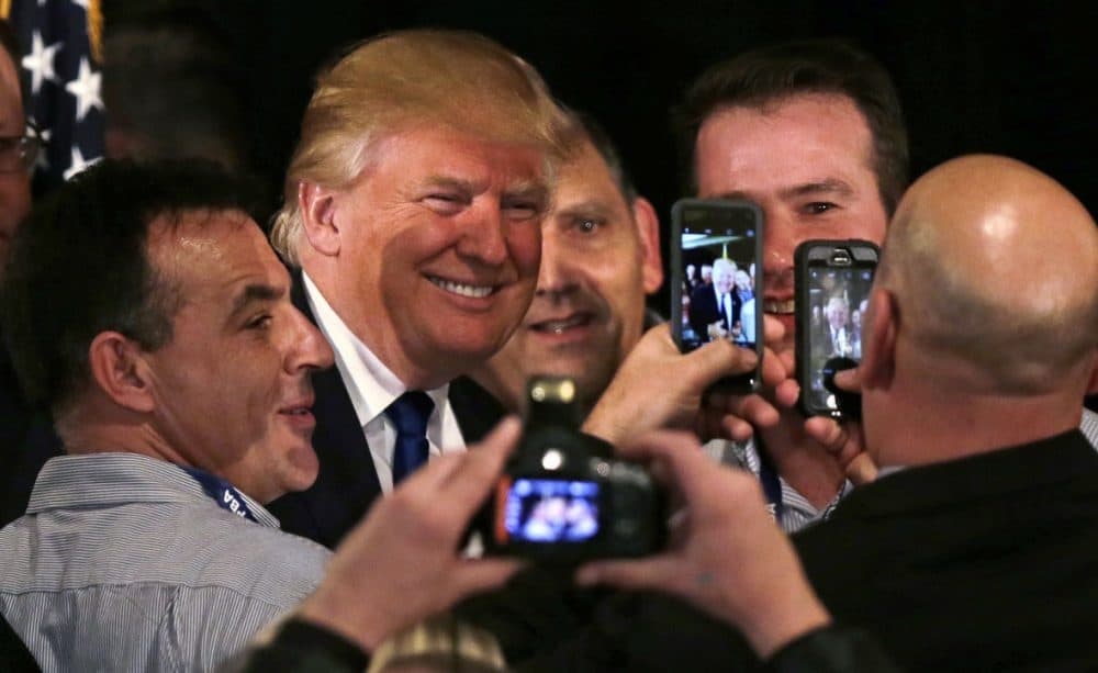Republican presidential candidate Donald Trump smiles as he has his photograph taken with supporters after being endorsed at a regional police union meeting in Portsmouth, New Hampshire on Thursday. (Charles Krupa/AP)