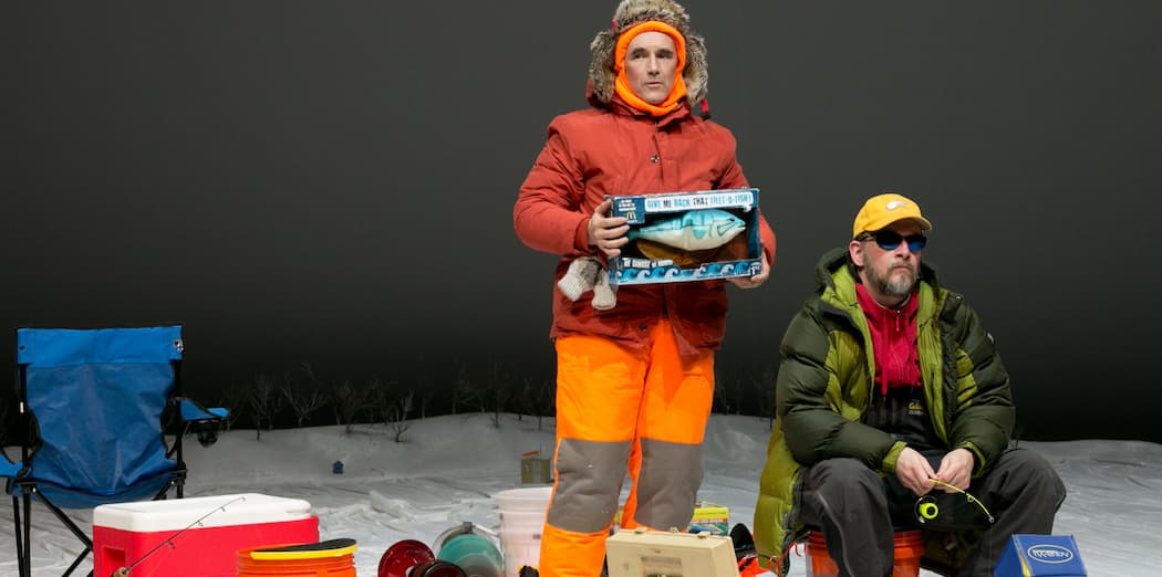 They are joined in turn by an officer of the Department of Natural Resources (Bob Davis) who facilitates a bit of comic relief in an extended exchange about the various permits required of the two men; fellow fisher Flo (Kayli Carter), who hangs out on a couch set up outside an ice house encasing a hot tub; and bearded sportsman Wayne, played capably by poet Jenkins in his stage debut.