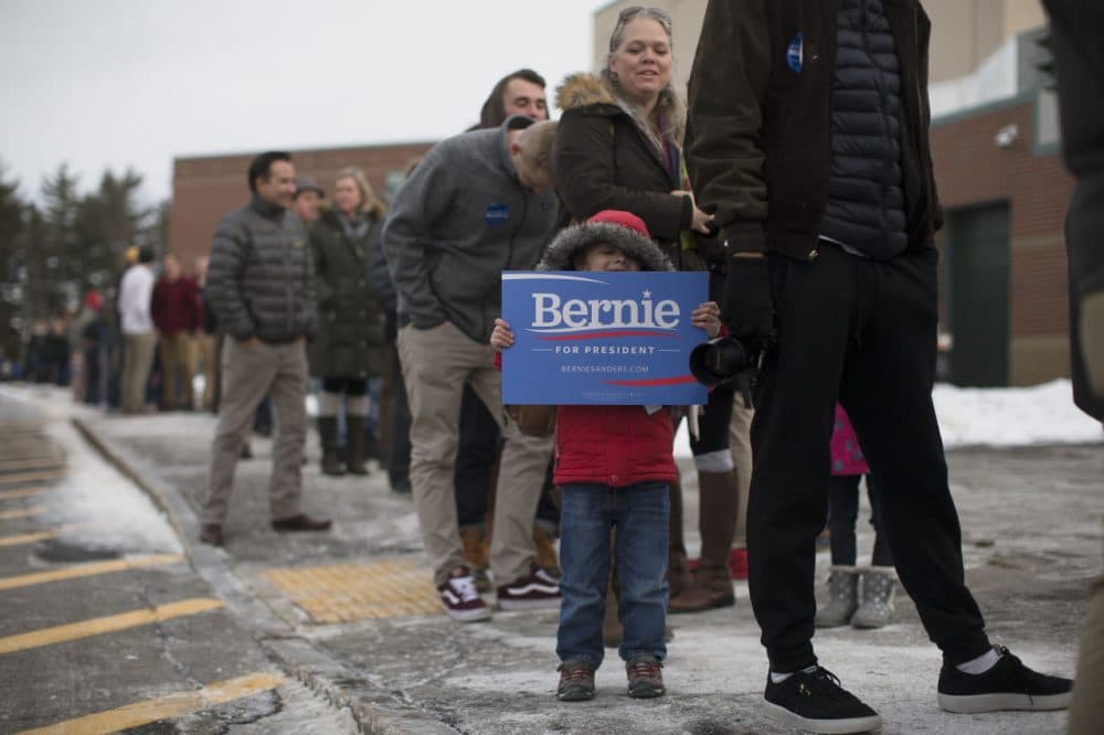 Sam Chausovsky holds a sign as attendees wait in line before a Bernie Sanders campaign event at Bedford High School last week. (John Minchillo/AP)