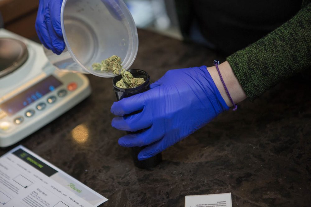 Under the teal dome of a former bank lobby, Ashley Cabana pulls the top off a plastic storage box labeled “Facewreck.” Cabana rests the box on a glass counter and flaps the lid, sending the aroma of marijuana toward Sam Brown.