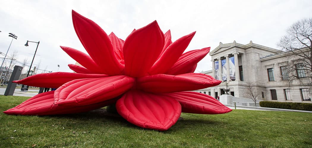 “To Choi Jeong Hwa, a space like where we stand now on the lawn of the Museum of Fine Arts — which feels natural — is really man-made. This was manicured and landscaped by people, it didn’t just happen in the wild,” he said, continuing, “and flowers like this inflatable, or even plastic flowers, in a way might even be better than natural world because they never die.”