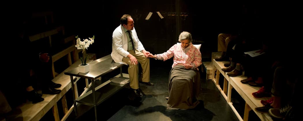 The set design (Julia Noulin-Mérat) aids greatly in getting at the heart of the uncomplicated dialogue. Audience members sit above the stage floor on bench risers as if watching a surgical theater down below. Onstage, an antiseptic steel table serves variously as a bed, couch or operating area. A matching steel chair fills out the set.