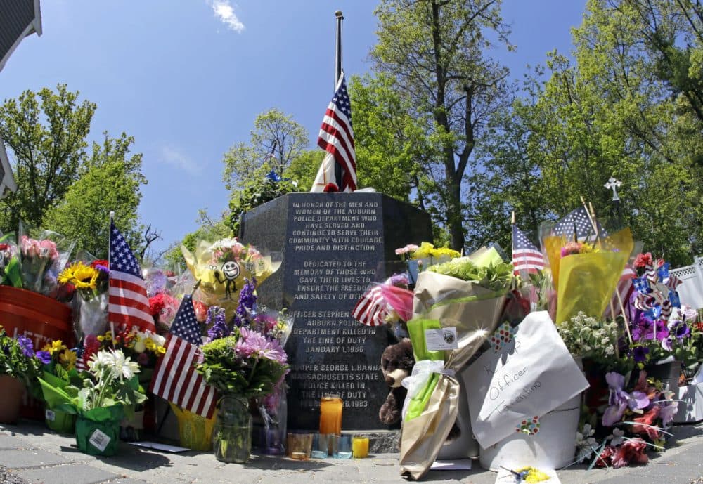 Outside the Auburn police station, the American flag was lowered to half-staff. The town's residents left bouquets of flowers and miniature American flags piled at the bottom of a stone monument dedicated to law enforcement officers killed in the line of duty.